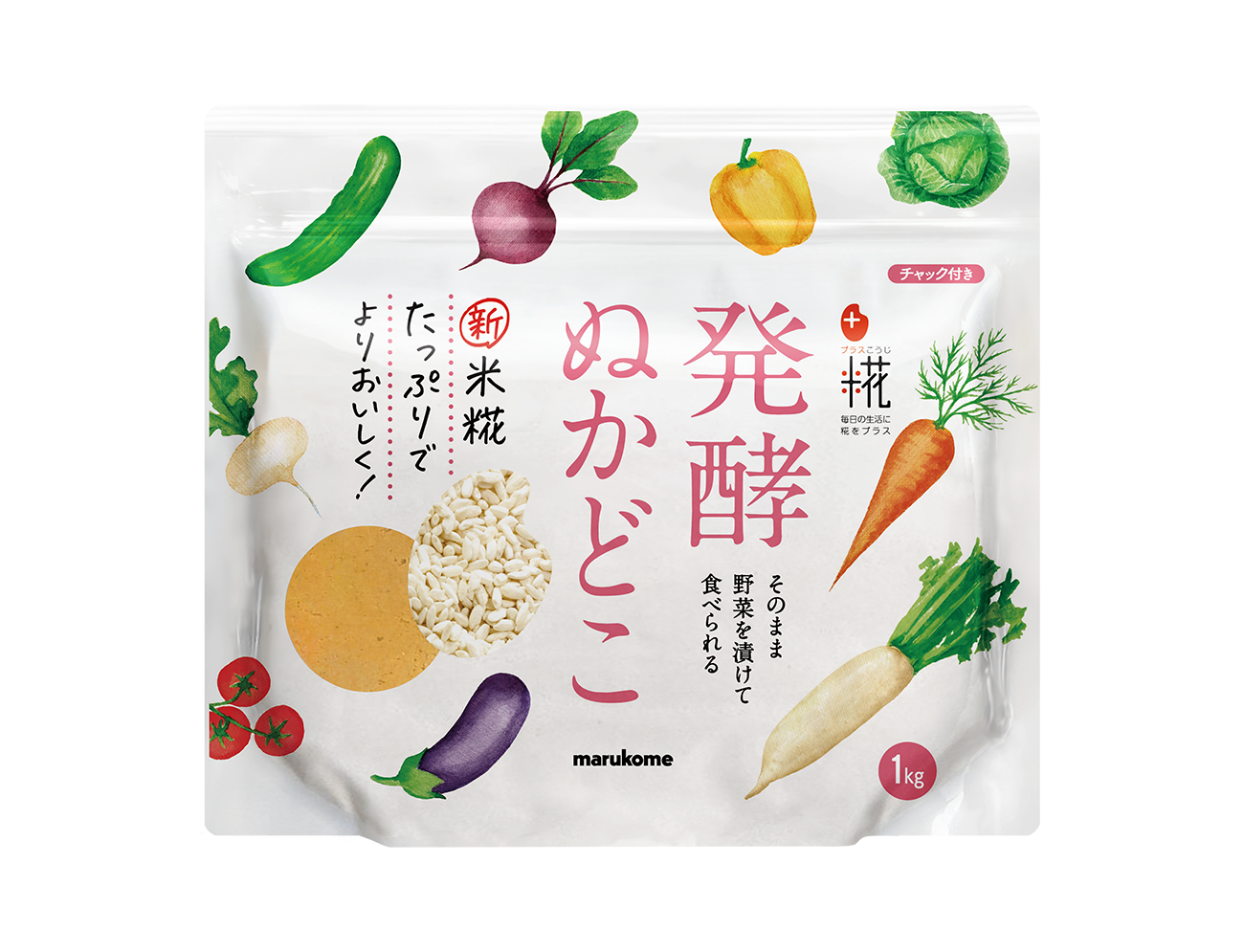 「プラス糀 発酵ぬかどこ」は米糀のほのかな甘みで、ぬか漬け初心者にも食べやすい味に仕上がります。ぬかどこに野菜の切れ端などを漬けて取り出す作業を繰り返し熟成させる下漬け作業が不要で、開封してすぐに野菜を漬けることができます。チャック付き袋で冷蔵庫の場所を取らない手軽さも支持されています。魚沼醸造の米糀を約1.3倍に増量したことで、豊かな甘みと旨みがアップしました。