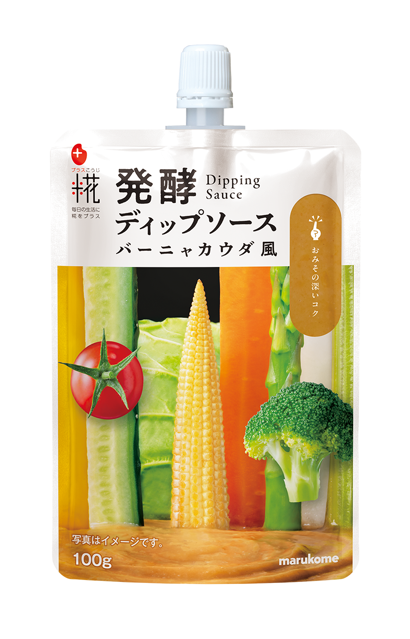 「プラス糀 発酵ディップソース バーニャカウダ風」は「プラス糀 生みそ 糀美人」を含む2種類の米みそを使用、アミノ酸などの調味料ではなく自然な旨みとにんにくをきかせました。きゅうり、トマト、アスパラ、にんじん、パプリカ、ブロッコリー、キャベツ、大根、コーンなど、さまざまな野菜に合う味わいを楽しめます。ヘルシーさや、写真映えする彩りの良さからも人気のあるバーニャカウダに、みそや塩糀などの発酵食品を組み合わせることで、美容・健康意識の高い方にも支持されるラインアップを目指しました。