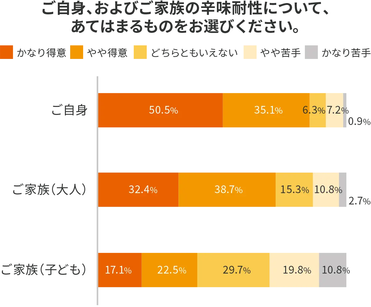 日本最大級の料理写真共有アプリ「Snapdish」(以下、スナップディッシュ)を運営するスナップディッシュ株式会社(所在地:東京都武蔵野市、代表取締役:舟田 善)協力のもと、同アプリのユーザーを対象に発売前の「辛みそ」でテストモニターを実施しました。調査では高まる辛味トレンドの中で大人の辛味好意度は85%以上。一方、子どもは40%未満という結果となり、家族内の“辛さギャップ”問題が明らかになりました。この解決策として、ちょい足し調味料のニーズが高まり「辛みそ」は高い評価を受けています。辛味が得意な大人も高い満足度(かなり辛味に得意なユーザーの92.8%が非常に満足)を得るという結果となりました。