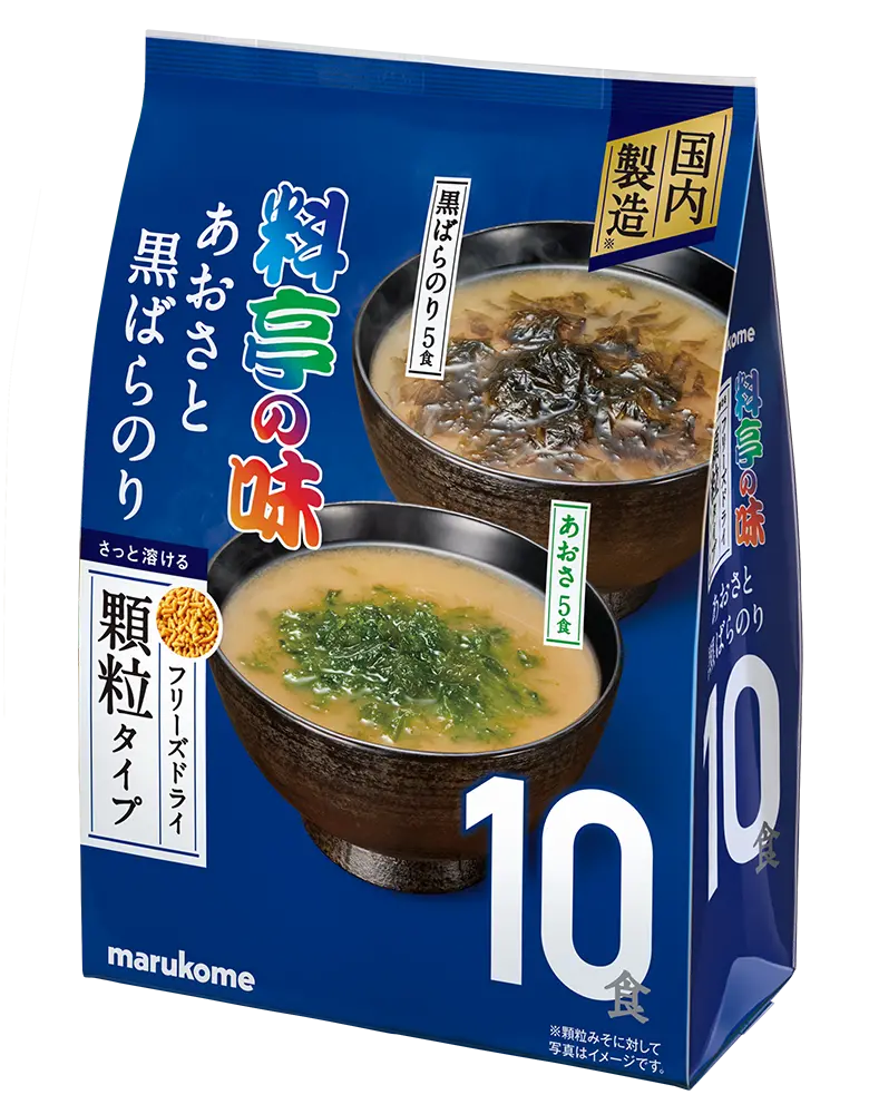 独自製法で生みその風味を味わえる顆粒みそを使用した即席みそ汁です。1つのパックに具材と顆粒みそが入っているため容器にあけてお湯を注ぐだけで簡単に本格的なみそ汁を楽しめます。具材はあおさ・黒ばらのりのアソートタイプ。あおさは国産の風味が良いものを使用、昆布だしをやや強めにして海藻の旨みを引き立てました。黒ばらのりは独自の乾燥方法で焙煎感が出ない条件で乾燥しています。焼きのりとは異なる、磯の香りやのり本来の食感を楽しめます。