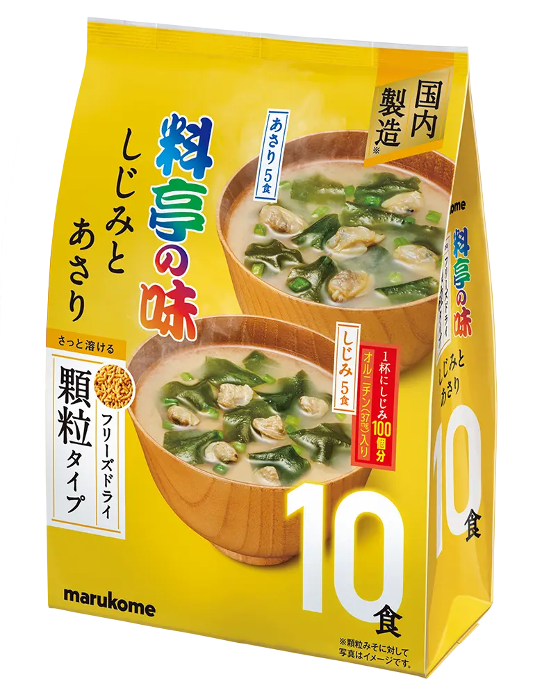 独自製法で生みその風味を味わえる顆粒みそを使用した即席みそ汁です。1つのパックに具材と顆粒みそが入っているため容器にあけてお湯を注ぐだけで簡単に本格的なみそ汁を楽しめます。しじみと、あさりのアソートタイプ。淡色系顆粒みそを使用し、具材の旨みがしっかりときいた味わいに仕上げました。しじみのみそ汁は、1杯でしじみ100個分のオルニチン(37mg)を含みます。