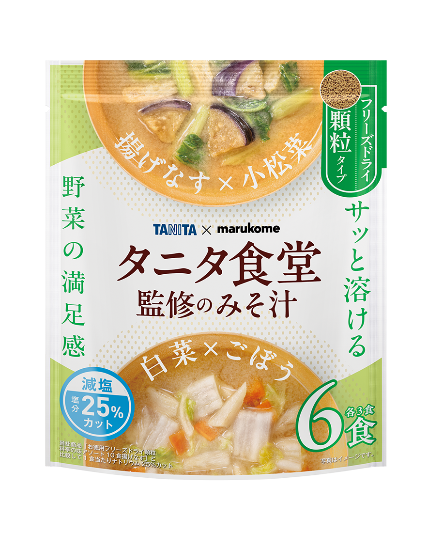 当社の「お徳用 フリーズドライ顆粒 料亭の味アソート(揚げなす)」と比較して、1食あたりのナトリウムを25%カットしたタニタ食堂監修の減塩タイプの顆粒みそ汁。3種のみそをブレンドした顆粒みそは減塩でも甘みを楽しめます。かつおだしをしっかりきかせて、やさしく旨みのある味わいに仕上げました。具材は「揚げなすと小松菜」「白菜とごぼう」の2種類。