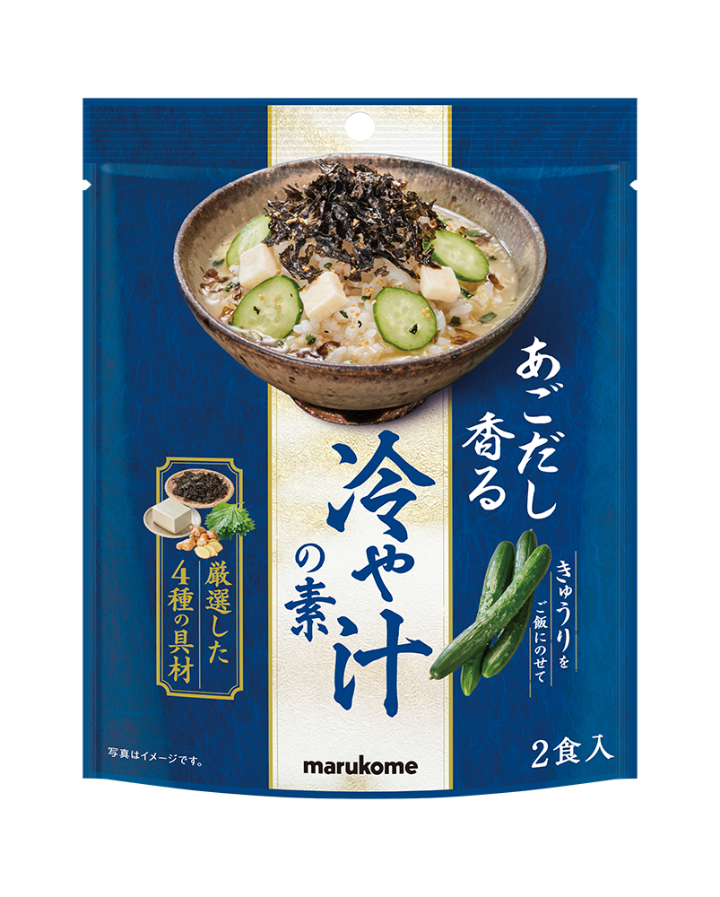 宮崎県の郷土料理、冷や汁は夏の猛暑も相まって熱中症対策や火を使わずに作れる手軽さから全国に定番メニューとして広がりを見せはじめています。当社では液みそシリーズで冷や汁の素を展開していますが、今回さらに手軽で収納にも便利な顆粒タイプを初めて商品化しました。「あごだし香る 冷や汁の素」は、株式会社タツノコ(本社:愛媛県西条市)の黒ばらのりと、青じそ、豆腐、しょうがの4種類の具材、顆粒みそとあごだしによる風味豊かな味わいにこだわりました。