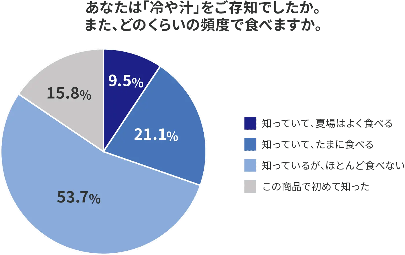 冷や汁を「知っているが、ほとんど食べない」が53.7%、「この商品で初めて知った」が15.8%と7割近い方が冷や汁にあまりなじみがないという現状が判明しました。