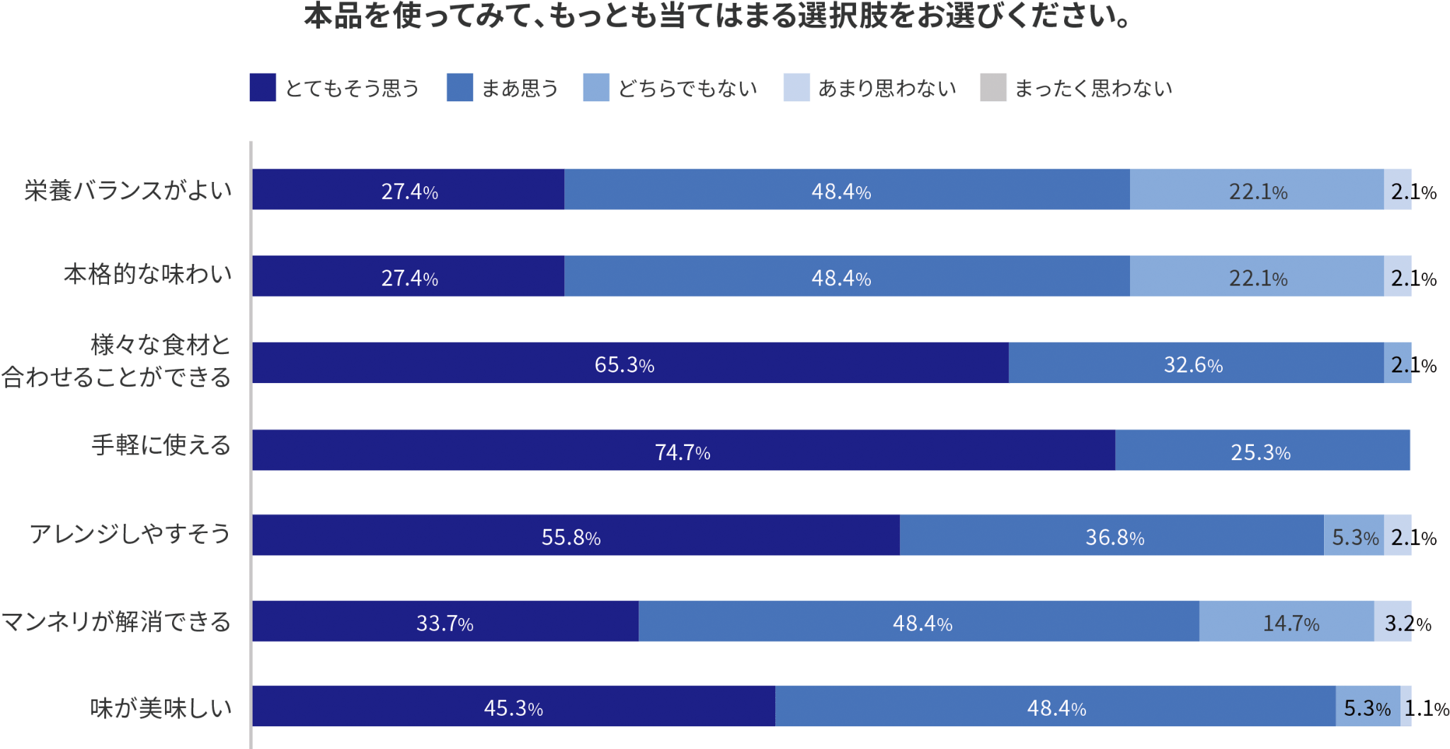 使ってみた評価としては、「手軽に使える」が74.7%、「様々な食材と合わせることができる」が63.5%と高い評価でした。