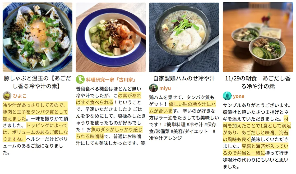 日本最大級の料理写真共有アプリ「Snapdish」(以下、スナップディッシュ)を運営するスナップディッシュ株式会社(所在地:東京都武蔵野市、代表取締役:舟田 善)協力のもと、同アプリのユーザーを対象に発売前の「あごだし香る 冷や汁の素」でテストモニターを実施しました。