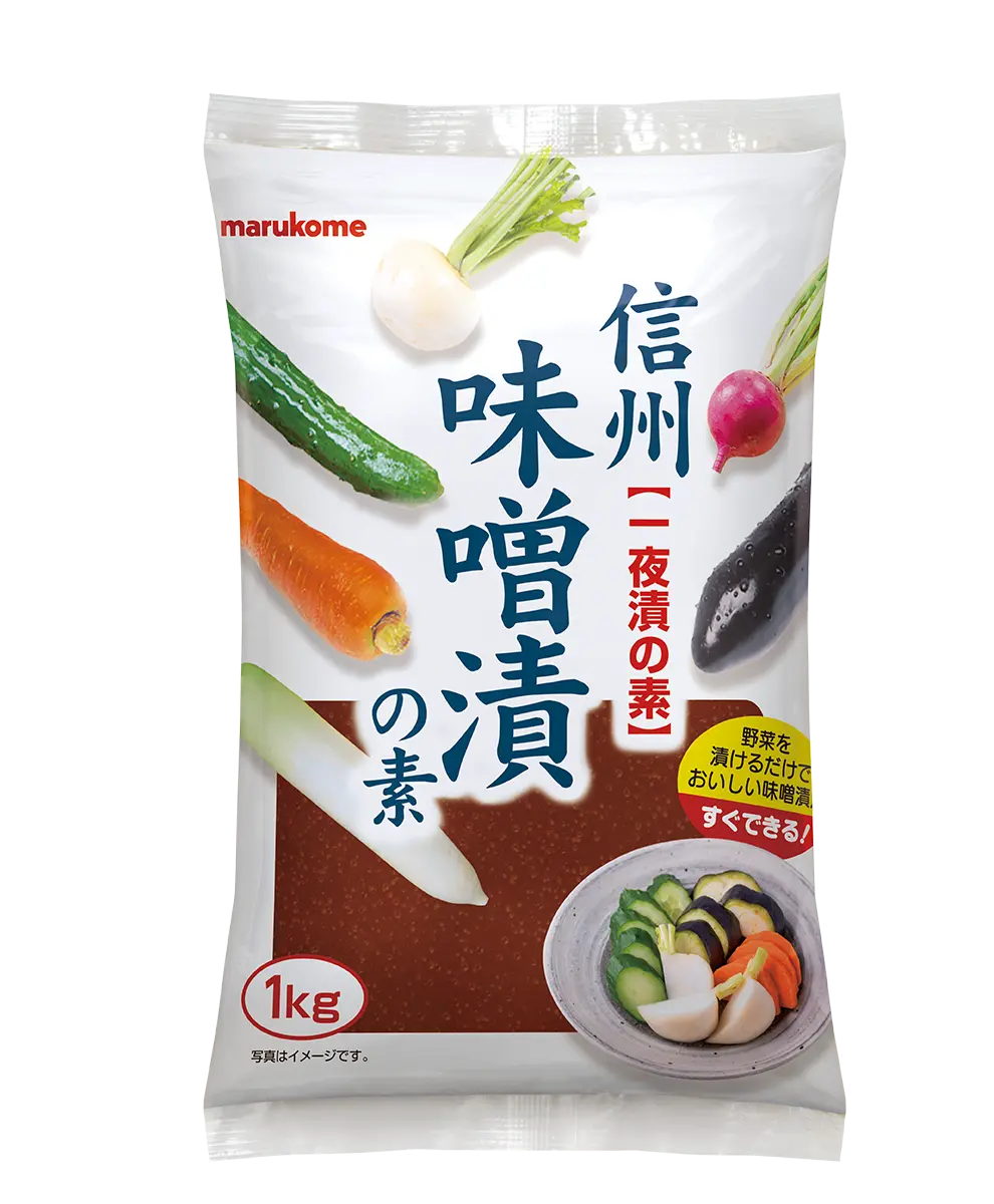 信州赤系の米みそを使用した上品な甘味を加えた一夜漬け用のみそです。塩分を控えめに従来の塩辛いみそにはない、ほどよい甘みのある美味しい漬物に仕上がります。