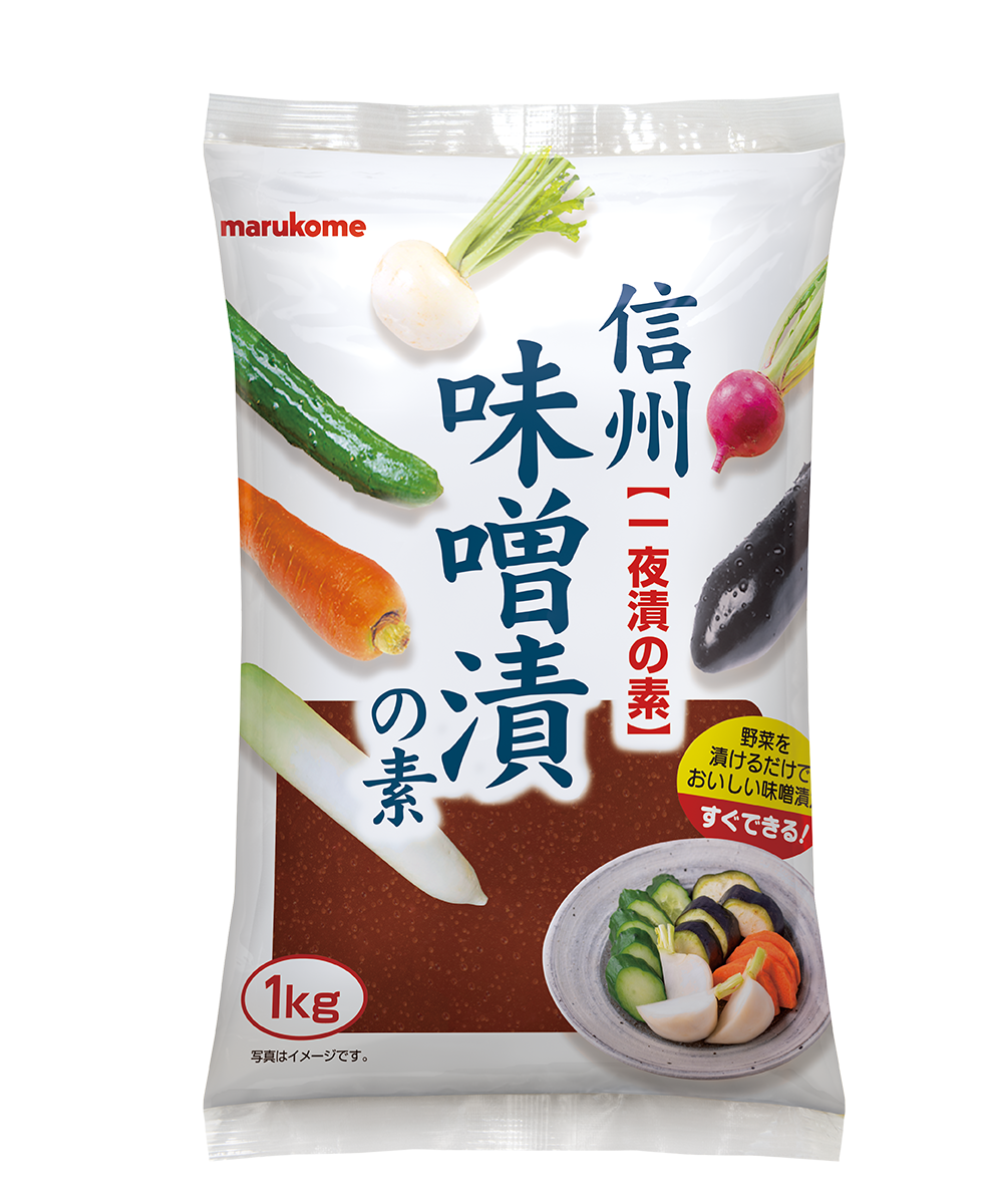 「信州味噌漬の素」は、信州赤系の米みそを使用した上品な甘みが特長の一夜漬け用みそです。塩分を控えめにし、従来の塩辛いみそにはない、ほどよい甘味のあるおいしい漬物に仕上がります。同商品は「大容量のタイプが欲しい」という声が多数寄せられ、あらたにラインアップしました。