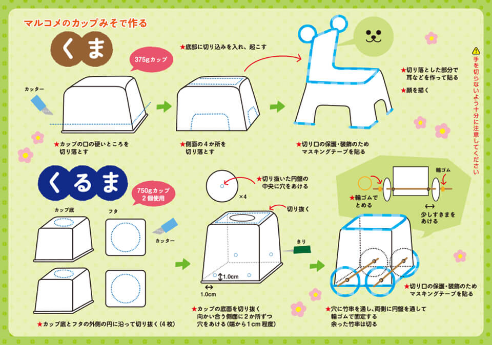 マルコメみそを使って「くま」や「くるま」を。タイヤもしっかり動きます。