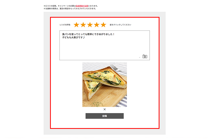 レシピページの「レシピレビュー投稿キャンペーンに関する記載」の中にある「応募する」ボタンをクリックしたら、応募完了です。