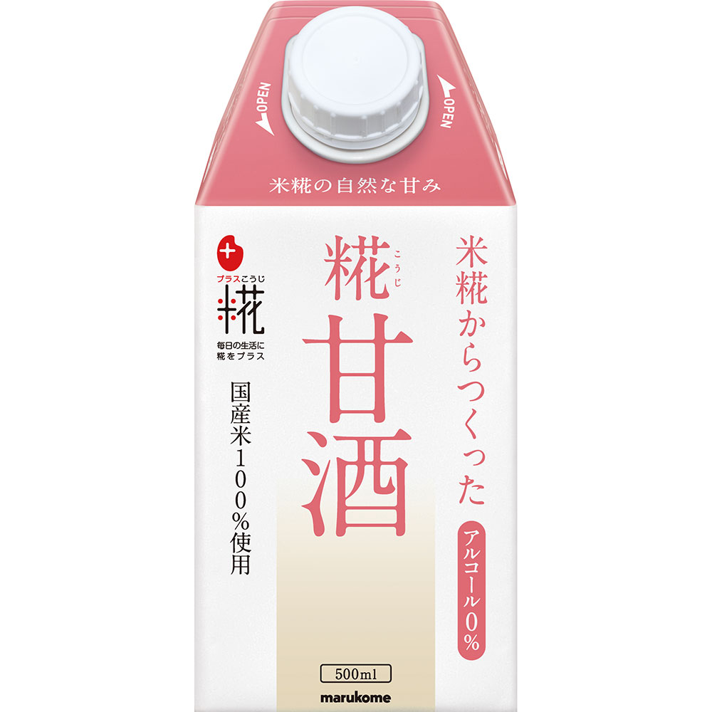 米、米こうじのデンプンを糖化し、自然な甘みを引き出したストレートタイプの糀甘酒です。砂糖不使用、アルコール0%の甘酒で、小さなお子様にも飲みやすく熱中症対策にもおすすめです。毎日飲む方にも嬉しい500mlの大容量タイプは、キャップ付きで注ぎやすい形状です。