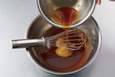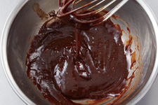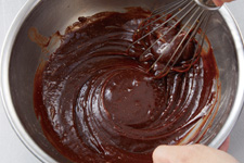 チョコレートに③の卵液を半量加え、乳化するまで泡立て器でしっかりすり混ぜます。残りの卵液を加え同様に混ぜ合わせます。生地がしまってきたら乳化した状態です。