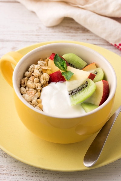 プレーンヨーグルトをかけ、食べやすい大きさに切ったキウイとりんごを乗せる。