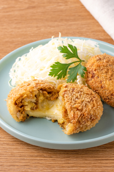 ②に①を混ぜ合わせて4等分にし、ピザ用チーズを中に入れて小判型に丸め、小麦粉、溶き卵、パン粉の順にまぶし、180℃に熱した揚げ油で揚げる。