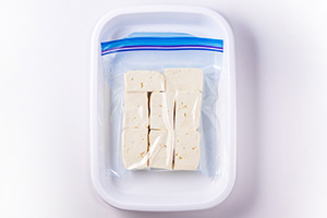 豆腐の水気をきり、8等分にカットし、フリーザーバッグに崩れないように入れ、空気を抜いて冷凍する。(丸1日以上かけてしっかり凍らせる)
