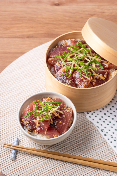 かつお、(a)、千切りにしたしょうが半量を混ぜて10~30分漬ける。
