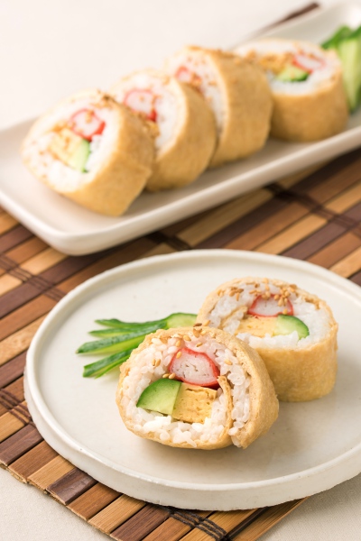 台にラップを大きめに広げ、いなりあげをのせて酢飯を敷き詰める(1本分の酢飯 約160g)。手前に具材を並べ、具材を軸にして巻き、ラップでぴっちりと包んでしばらく置いてなじませる。