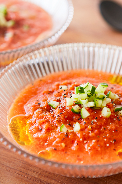 器に盛り、オリーブオイルをまわしかけ、飾り用きゅうり、粗挽き黒こしょうをトッピングする。