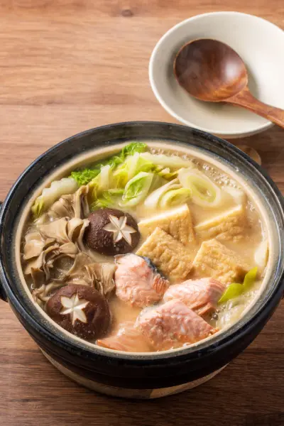 土鍋に①を並べ入れ、水を注いでほどよく煮込み、「料亭の味 粕汁の素」を加えてひと煮立ちさせる。
